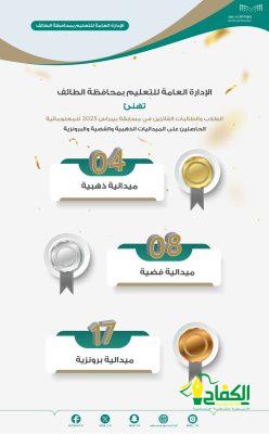 وحصد طلبة تعليم جازان على 4 ميداليات ذهبية و8 فضية و 17 برونزية ،وهنأ المدير العام للتعليم في محافظة الطائف الدكتور سعيد بن عبدالله الغامدي الطلاب والطالبات الفائزين في المسابقة، وأسرهم، ومدارسهم؛ لقاء تحقيق هذا الإنجاز الذي يضاف إلى سلسلة الإنجازات التي حققها طلاب وطالبات المحافظة على المستويين المحلي والعالمي. ومشيدًا بجهود إدارة الأداء التعليمي – قسم النشاط الطلابي- للوصول بالطلاب والطالبات لهذا المستوى من الإنجاز وتحقيق النتائج.