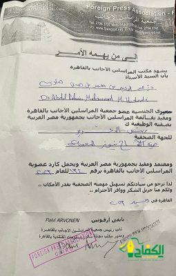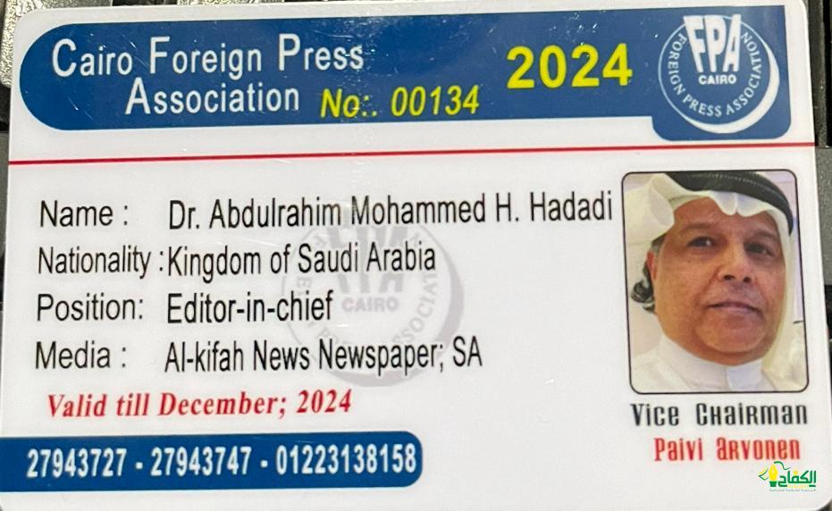 تمت عضويتي في جمعية المراسلين الأجانب بالقاهرة ومقيد بقائمة المراسلين الأجانب بجمهورية مصر العربية بصفتي الوظيفية رئيس تحرير صحيفة الكفاح نيوز ومعتمد ومقيد بجمهورية مصر العربية بكادر عضوية المراسلين الأجانب بالقاهرة برقم 134 للعام 2023 سارية حتى ديسمبر 2024.