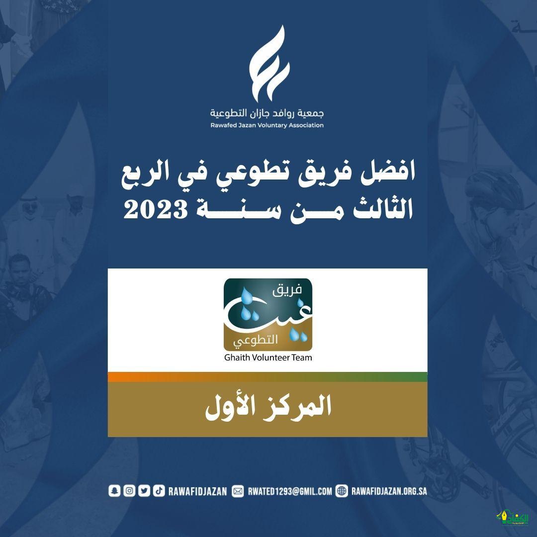 حقق فريق غيث التطوعي التابع لجمعية روافد جازان التطوعية ، المركز الاول في الربع الثالث و المركز الاول في جميع ارباع السنة الميلادية 2023 م ، وبتعاون مع العديد من الجهات الحكومية والجمعيات والمؤسسات، وذلك من خلال تنظيم وتنفيذ اكثر من 15 مبادره توعوية وتثقيفية و مجتمعية تستهدف جميع فئات المجتمع ومن ابرزها، “ضحكتهم غايتنا ، روح وفرح ، العمل الانساني ، إبتسامتي مرآتي ، جازان تتطوع ، غيمة فنون ، نُحيي آملًا”.