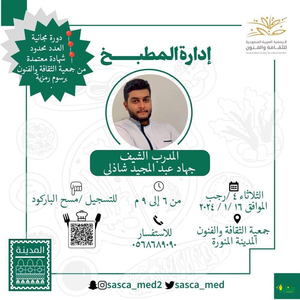 تنظم جمعية الثقافة والفنون بالمدينة المنورة مساء اليوم الثلاثاء ، دورة مجانية بشهادة معتمدة من الجمعية برسوم رمزية بعنوان ( إدارة المطبخ ) للمدرب الشيف – جهاد عبدالمجيد شاذلي من الساعة 6 مساء إلى 9 مساء بمقر الجمعية.
