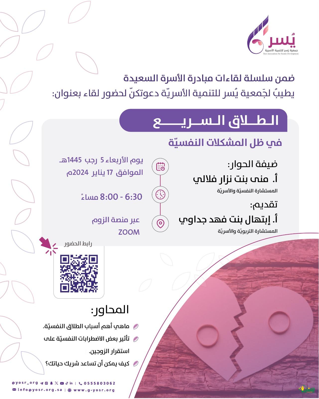 ضمن سلسلة لقاءات مبادرة الأسرة السعيدة التي تنظمها جمعيّة يُسر للتنميّة الأسريّة بمكة المكرمة – تقيم الجمعية لقاء بعنوان:( الطلاق السريع في ظل المشكلات النفسيّة) أوضحت ذلك الأستاذة الدكتورة هيفاء عثمان فدا – رئيسة مجلس إدارة الجمعية وأشارت بأن ضيفة الحوار الاستاذة : منى بنت نزار فلالي (المستشارة النفسيّة والأسريّة) واللقاء من تقديم: الأستاذة إبتهال بنت فهد جداوي(المستشارة التربويّة والأسريّة) وأكدت الدكتورة هيفاء فدا بأن محاور اللقاء: ماهي أهم أسباب الطلاق النفسيّة.