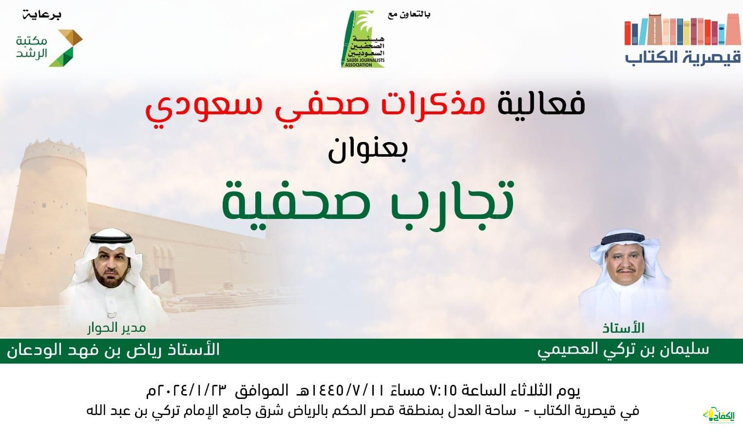 برعاية أحد المكتبات وبالتعاون مع هيئة الصحفيين السعوديين تستضيف قيصرية الكتاب فعالية ” مذكرات صحفي سعودي” بعنوان “تجارب صحفية” حيث تستضيف الأستاذ سليمان بن تركي العصيمي ليتحدث عن تجربته الصحفية ، ويدير الحوار الأستاذ رياض بن فهد الودعان وذلك يوم الثلاثاء بتاريخ ١٤٤٥/٠٧/١١ الموافق 23 يناير 2024 الساعة ٠٧:١٥ مساء.
