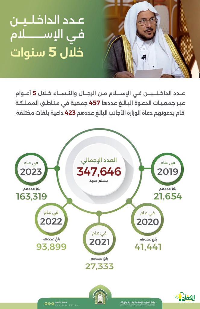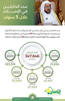 أعلنت وزارة الشؤون الإسلامية والدعوة والإرشاد، أنه خلال الخمس أعوام السابقة، بلغ عدد الداخلين في الإسلام من الرجال والنساء 347،646 ألف مسلم قام بدعوتهم دعاة الوزارة الأجانب البالغ عددهم 423 داعية عبر (457) جمعية دعوة بمختلف مناطق المملكة.