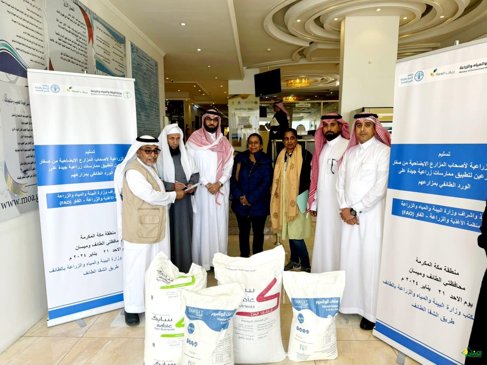 نفذ مكتب وزارة البيئة والمياه والزراعة بمحافظة الطائف، برنامج تسليم الاسمدة لمزارعي الورد الطائفي الايضاحية من صغار المزارعين وذلك بالتعاون مع برنامج التنمية الريفية الزراعية المستدامة “ريف” ومنظمة الأغذية والزراعة للأمم المتحدة “الفاو”.