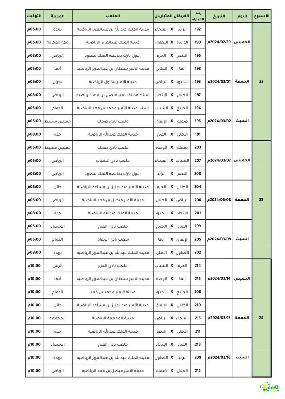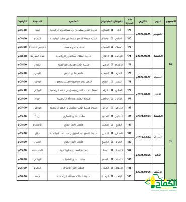 أعلنت إدارة المسابقات في رابطة الدوري السعودي للمحترفين، الاثنين 22 يناير 2024، عن مواعيد إقامة المباريات للجولات من 20 حتى 24 من دوري روشن السعودي لموسم 2023-2024.