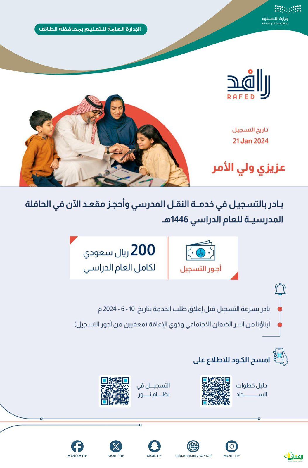 أوضحت الادارة العامة للتعليم في محافظة الطائف , بدء التسجيل في خدمة النقل المدرسي للعام الدراسي القادم 1446 ، وذلك عبر نظام نور.
