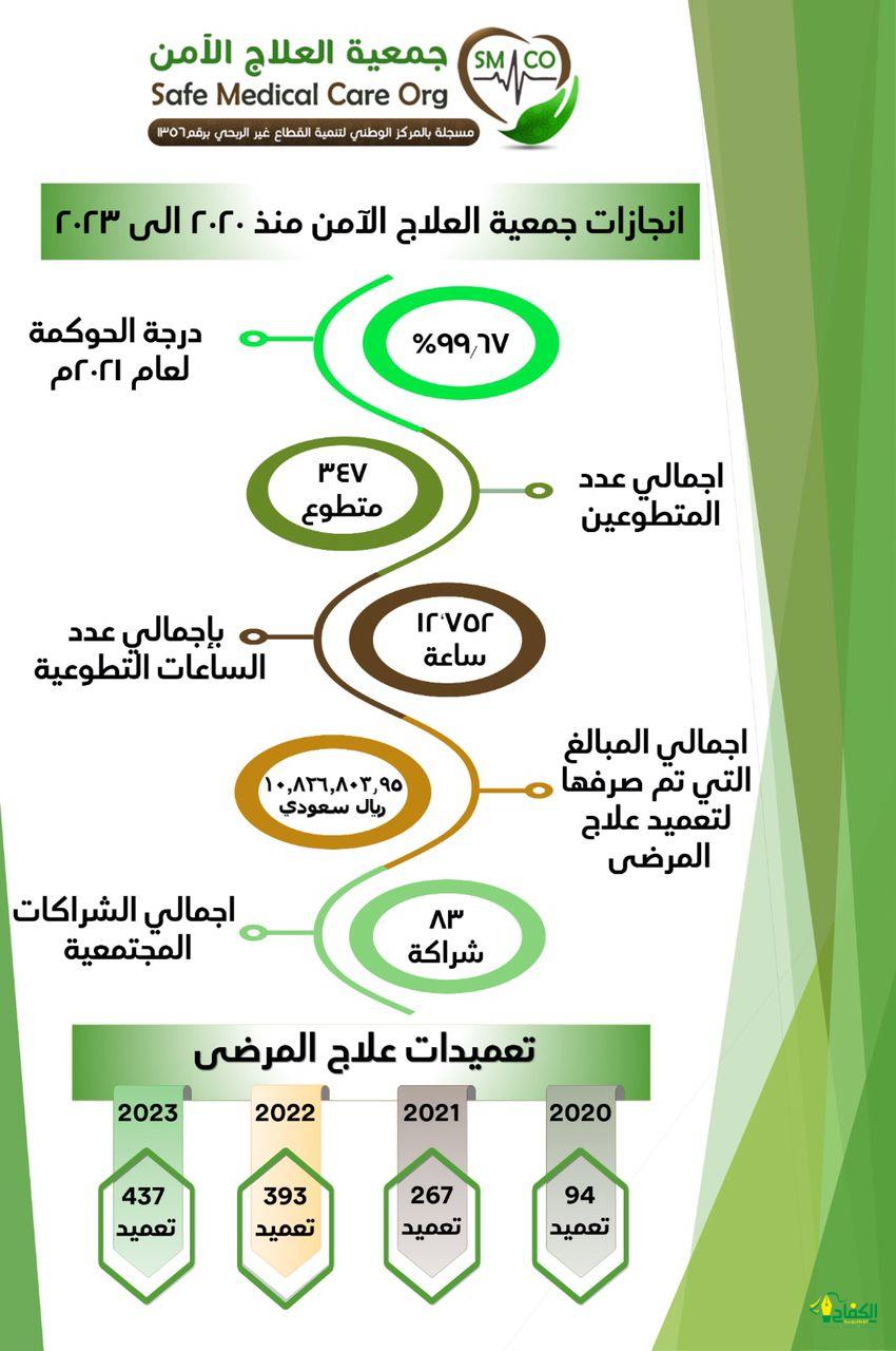 أولا : في مجال علاج المرضى: إذ بلغ عدد تعميدات علاج المرضى لعام ٢٠٢٠ (٩٤) تعميداً بإجمالي المبلغ: ٤٧٢,۹۸۰ ريال ، بينما بلغ عدد تعميدات علاج المرضى لعام ٢٠٢١ (٢٦٧) تعميداً ، بإجمالي المبلغ: – ١،٩٥١،٧٨٢،٢٥ ريالاً ، فيما بلغ عدد تعميدات علاج المرضى لعام ۲٠٢٢ (۳۹۳) تعميداً ، بإجمالي المبلغ: ٣,٥٩٤,۷۸۱,۳۱ ريال ، وبحمد الله بلغ عدد تعميدات علاج المرضى لعام ٢٠٢٣ (٤٣٧) تعميدًا بإجمالي مبلغ ٤,٨٠٧,٢٦٠,٣٩ ريالاً.