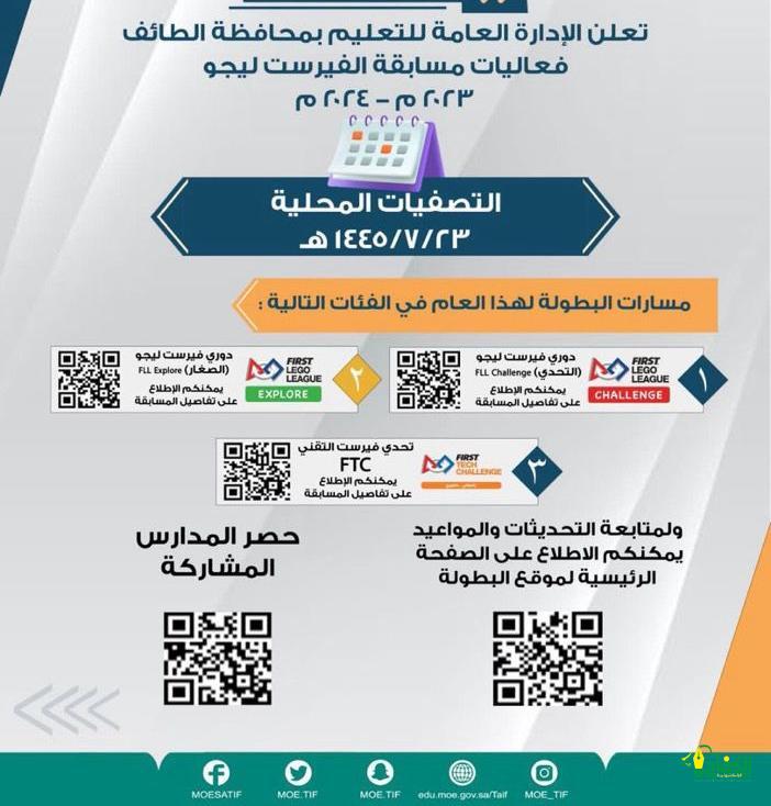 أطلقت الإدارة العامة للتعليم بمحافظة الطائف فعاليات مسابقة بطولة الفيرست ليقو 2024 والمخصصة لجميع المراحل الدراسية ودوري فيرست ليجو “ التحدي “و يستهدف الفئة العمرية من ٩ أعوام إلى ١٦ عام وبعدد أربعة طلاب للفريق ، ودوري فيرست ليجو “ الصغار “ ويستهدف الفئة العمرية من ٦ أعوام إلى ١٠ أعوام ، ودوري تحدي فيرست التقني ويستهدف الفئة العمرية من ١٢ عام إلى ١٨ عام . تجدر الإشارة أن مسابقة فيرست ليغو هي مسابقة دولية تقام بشكل سنوي بتنظيم من منظمة اتحاد الفيرست ليغو الدولي حيث يتم طرح تحدي من خلال موضوع جديد ليقوم الطلاب ؛ وتقوم المنظمة بوضع موضوع المسابقة عن طريق البحث عن المواضيع المثارة في جهات الأبحاث العالمية.