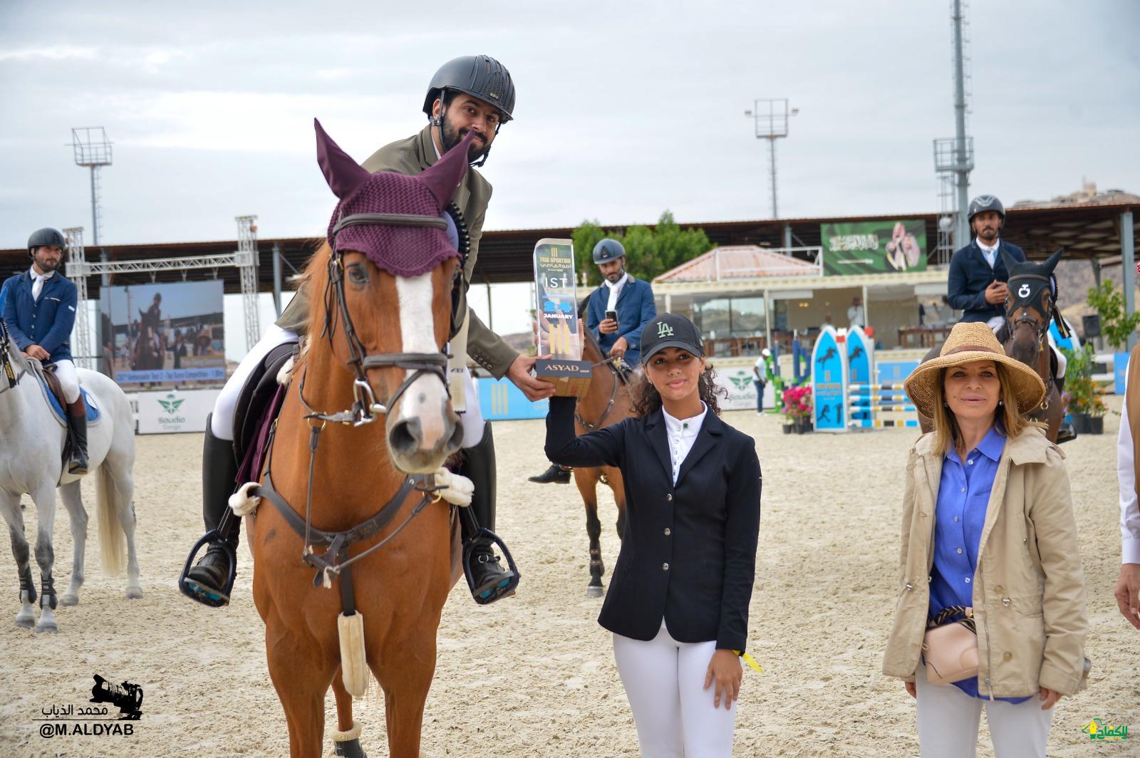 وكان الفارس محمد العساكر اول الفائزين في ثاني أيام البطولة بجمعه اكبر عدد من النقاط 1450 نقطة بزمن قياسي أيضا 88.84 ثانية لشوط السفراء بحواجزه البالغة 100 سم حيث استخدم ذكاءه والسرعة في اختصار المسافات، وحل في المركز الثاني الفارس عبدالمجيد خماش بجواه صفوان وجمع 1320 نقطة متساويا بالنقاط مع الفارس عبدالرحمن البلادي ومتقدما عليه بفارق الزمن ، وقد أقيم الشوط برعاية شركة اسياد حيث توجت السيدة زينه اسامه السيد الفائزين الخمسة الأول.