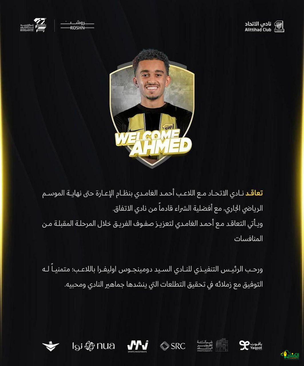 أنهت إدارة نادي الاتحاد التعاقد مع لاعب خط وسط نادي الاتفاق أحمد الغامدي بنظام الإعارة حتى نهاية الموسم الحالي مع أفضلية الشراء ويأتي التعاقد مع الكابتن أحمد الغامدي لتعزيز صفوف الفريق خلال المرحلة المقبلة.