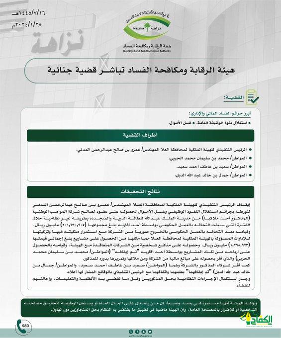 باشرت هيئة الرقابة ومكافحة الفساد التحقيقات في قضيةً جنائية بالمدينة المنورة.