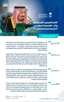 وتناول المجلس إثر ذلك، مستجدات الأحداث على الساحتين الإقليمية والدولية، مجدداً التأكيد على أهمية اتخاذ المجتمع الدولي المزيد من التدابير لوقف إطلاق النار في قطاع غزة، وتوفير الحماية للشعب الفلسطيني، ومحاسبة قوات الاحتلال الإسرائيلي على انتهاكاتها الممنهجة للقانون الدولي والقانون الدولي الإنساني، والتأكيد على أن المملكة ستبقى تَنشُد السلام وترعاه مُسًّخِرةً جهودها لكل ما من شأنه إحلال الأمن والسلم في المنطقة.