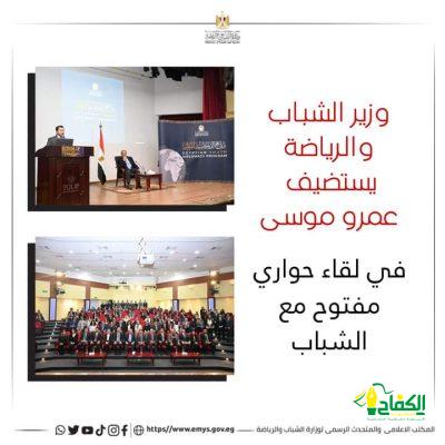 استضاف الدكتور أشرف صبحي وزير الشباب والرياضة، السيد عمرو موسى، الأمين العام لجامعة الدول العربية الأسبق ووزير الخارجية الأسبق، خلال لقاء حواري مفتوح مع الشباب، بالمركز الأوليمبي بالمعادي.