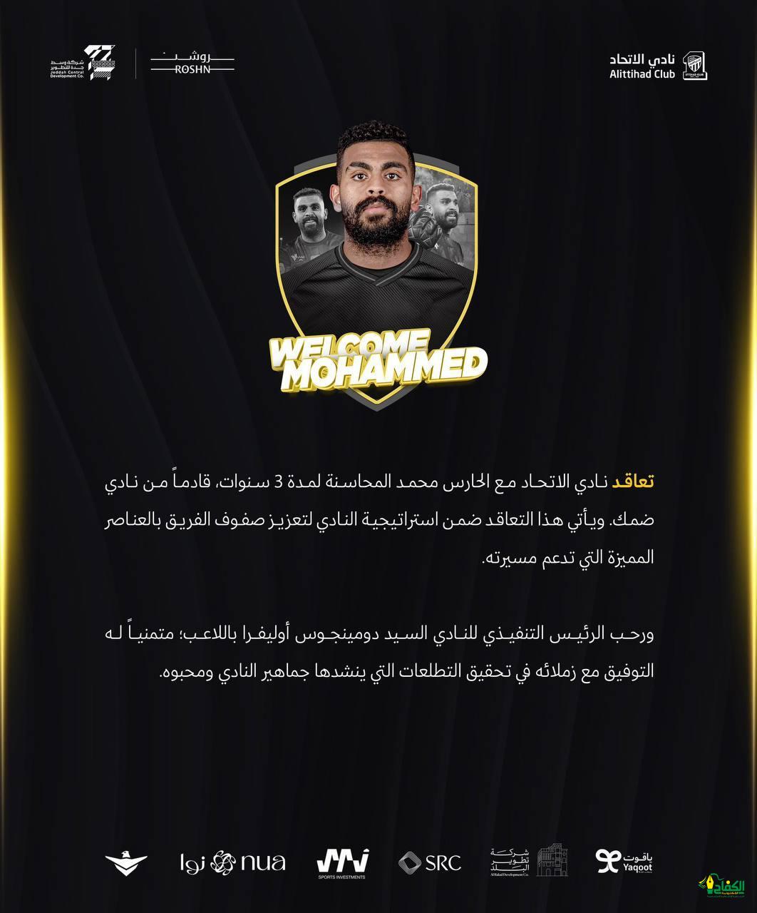 أنهت إدارة نادي الاتحاد التعاقد مع حارس نادي ضمك محمد المحاسنة لمدة ثلاث سنوات ويأتي التعاقد مع ضمن إستراتيجية النادي لتعزيز صفوف الفريق بالعناصر المتميزة.