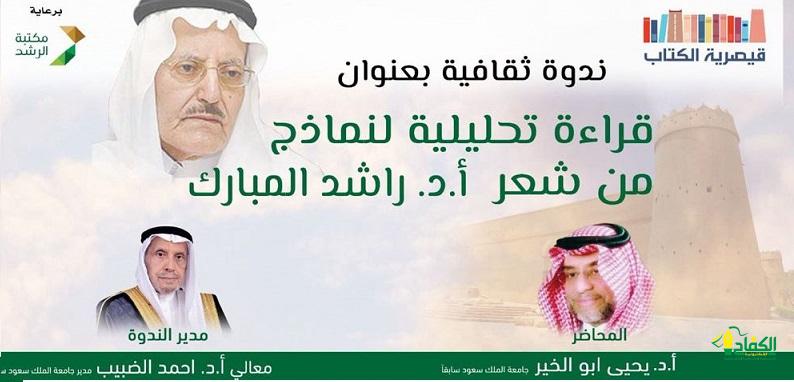 برعاية مكتبة الرشد تستضيف قيصرية الكتاب ندوة ثقافية بعنوان ” قراءة تحليلية لنماذج من شعر أ.د. راشد المبارك” يشارك فيها أ.د. يحي ابو الخير – جامعة الملك سعود سابقا ويدير الحوار أ.د. أحمد الضبيب مدير جامعة الملك سعود سابقا وذلك يوم الثلاثاء بتاريخ ١٤٤٥/٠٧/٢٥ الموافق
