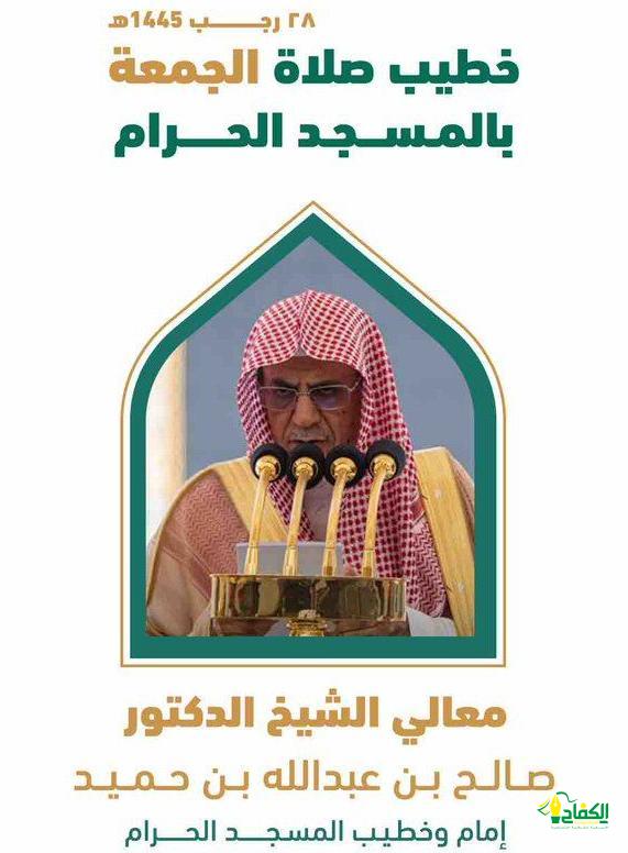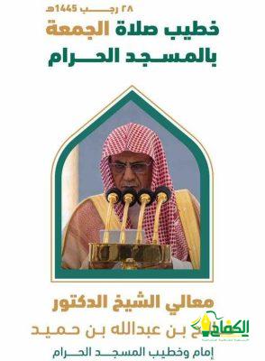 حددت الهيئة العامة لشؤون المسجد الحرام والمسجد النبوي الشريف خطيبا يوم بعد غد الجمعة 28 رجب 1445هـ، حيث سيكون إمام وخطيب المسجد الحرام معالي الشيخ الدكتور صالح بن عبدالله بن حميد بينما سيكون إمام وخطيب الجمعة بالمسجد النبوي فضيلة الشيخ الدكتور صلاح بن محمد البدير.