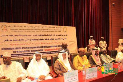 أقامت وزارة الشؤون الإسلامية والدعوة والإرشاد أمس، الحفل الختامي لمسابقة مالي الوطنية لحفظ القرآن الكريم وتفسيره التي نظمتها بالتعاون مع إتحاد مراكز حلقات تحفيظ القرآن الكريم في جمهورية مالي خلال الفترة من 7 ـ 11 رجب لعام 1445هـ الموافق 19ـ 23 يناير 2024م، بمشاركة 100 متسابق ومتسابقة مثلوا جميع أقاليم جمهورية مالي، بحضور سفير خادم الحرمين الشريفين لدى مالي الأستاذ خالد بن مبروك الخالد، ووزير الشؤون الدينية والعبادة المالي محمد عمر كوني، وعدد من الشخصيات السياسية والاجتماعية والدينية البارزة.