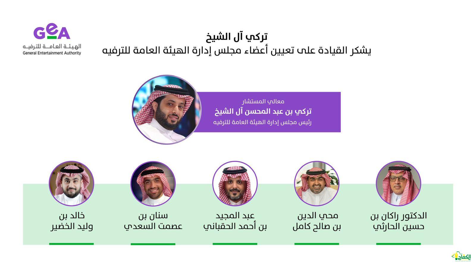 رفع معالي المستشار تركي بن عبد المحسن آل الشيخ رئيس مجلس إدارة الهيئة العامة للترفيه (GEA) ، أسمى عبارات الشكر والتقدير إلى خادم الحرمين الشريفين الملك سلمان بن عبد العزيز آل سعود، وإلى سمو ولي عهده الأمين صاحب السمو الملكي الأمير محمد بن سلمان بن عبد العزيز رئيس مجلس الوزراء حفظهم الله – على الثقة الكريمة بتعيين أعضاء مجلس إدارة الهيئة من المهتمين والمتخصصين في المجالات ذات العلاقة بعمل الهيئة.