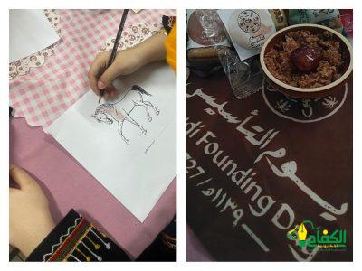 انه يوم تأسيس يؤرخ لأوقات تاريخية قادت للحاضر المزدهر ويوم التأسيس ولدت فيه دولتنا المباركة وأن هذا الأحتفاء يهدف إلى أعتزاز بنات الوطن وابنائه بالجذور الراسخة لهذه الدولة وارتباطهم الوثيق بها منذ ما يقارب من ثلاثة قرون ويحق لنا أن نفخر ونفاخر بحكومتنا الرشيدة رعاها الله فذكرى يوم التأسيس يعتبر له تاريخ ومكان لامثيل له في قلوبنا جميعاً فالتحية لمن أسسوا هذا الوطن وعقبها كلمة مديرة المدرسة تحدثت فيها وقالت يوم التأسيس من أهم الأحداث في تاريخ وطننا الحديث الذي يؤكد عراقة هذا الوطن الشامخ وجاء هذا الأحتفال أعتزاز وفخر بتأسيس بلادنا وتلاها كلمة رائدة النشاط الأستاذة باسمة الثمالي ذكرت فيها أن يوم التأسيس عطاء وإنجازات وفخر لكل سعودي ويوم التأسيس في قلوب مواطنيه ونفخر بأمجاد هذا الوطن العظيم وعبرت الطالبات عن امتنانهم واعتزازهم بالوطن الحبيب كما تجلت مظاهر أحتفال الطالبات بهذه المناسبة بارتدائهم الأزياء التقليدية التراثية ولقد توج هذا الحفل بالأهازيج والاغاني الوطنية ابتهاجاً وفرحة بذكر التأسيس لهذا الكيان العظيم التي شارك فيها الطالبات وأثارت حماس الحضور وختم الحفل في أجواء تميزت بروح الأعتزاز والفرح وفي نهاية الحفل تم تكريم المشاركات والمنظمات وتوزيع الهدايا والشهادات والجوائز على الحاضرات داعين الله أن يحفظ القيادة والشعب وأن يديم على الوطن نعمه الأمن والأمان والرخاء والازدهار.