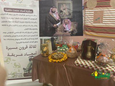 وركن الأزياء التقليدية والحرف اليدوية وركن المأكولات الشعبية وركن التوزيعات أقيم الحفل بإشراف مديرة المدرسة الاستاذة نوال العقيلي وقائدة فريق أصداء الإعلامي التطوعي الكاتبة الإعلامية د/ ليلى الشيخي وحضور عدد كبير من الهيئة التعليمية والإدارية والطالبات وعضوات الفريق بدأ الحفل بايات من الذكر الحكيم ثم السلام الملكي السعودي وتوالت فقرات الحفل وقد شارك الحفل عضوات الفريق ومنسوبات المدرسة كما قدمن الطالبات مشاركات كبيرة ومسرحية وألقت قائدة فريق أصداء الإعلامي التطوعي التطوعي الكاتبة الإعلامية ليلى الشيخي كلمة بهذه المناسبة ذكرت من خلالها أن يوم التأسيس يعتبر يوماً مجيداً وخالداً في ذاكرة الأبناء وتأسيس الأمس هو واقع اليوم وتطلعنا للمستقبل.