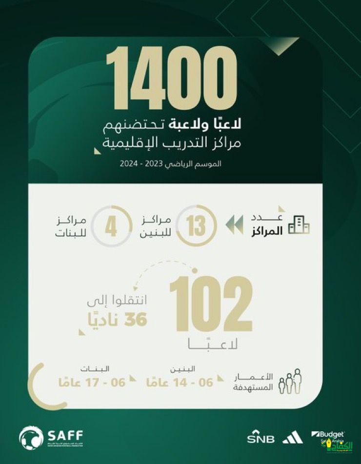 يواصل أكثر من 1400 لاعب ولاعبة تمارينهم اليومية في مراكز التدريب الإقليمية البالغ عددها 17 مركزًا منها 4 مراكز للبنات، وتتوزع هذه المراكز في الرياض “4 مراكز”، والدمام “مركزين” وجدة “مركزين” والأحساء، وتبوك، وحائل، والقصيم، وجازان، ومكة المكرمة، والطائف، ونجران، والمدينة المنورة، تحت إشراف أجهزة وطنية من مدربين ومدربات معتمدين بالإضافة لأجهزة إدارية وطبية.