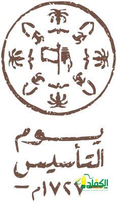 أما شعار يوم التأسيس فيتكون من العلم السعودي، والنخلة، والصقر، والخيل العربية، والسوق، خمسة عناصر جوهرية تعكس تناغما ً تراثيا ً حياً، وأنماطا مستمرة، هي رموز شعار يوم التأسيس. من النخلة الشامخة الكريمة وثمارها مثل الخضري والمقفزي ونبتة سيف والرشودي والقطار كما وصفه الشاعر حمود العضيدان (ت 1362 هـ) مني سالم ٍ عد مأمور الأمطار – من مزنة كنه شخانيب قــــــاره – ألـذ وأزين من مراطيب قطار – لا جابــه الخرَاف وسط الغضـارة.
