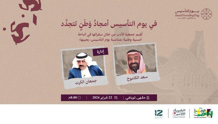 بمناسبة يوم التأسيس لوطننا الغالي الذي يصادف 22 فبراير ينظم سفراء جمعية الأدب بمنطقة الباحة أمسية ثقافية يشارك الأديب والمؤرخ الأستاذ سعد الكاموخ بطرح ورقة تحت عنوان (يوم التأسيس مسيرة خير وعطاء وبناء ونماء موفقة) . بمقهى “تويلفي” الشريك الأدبي بمنطقة الباحة.
