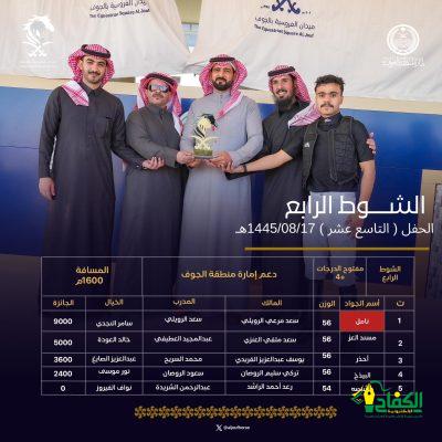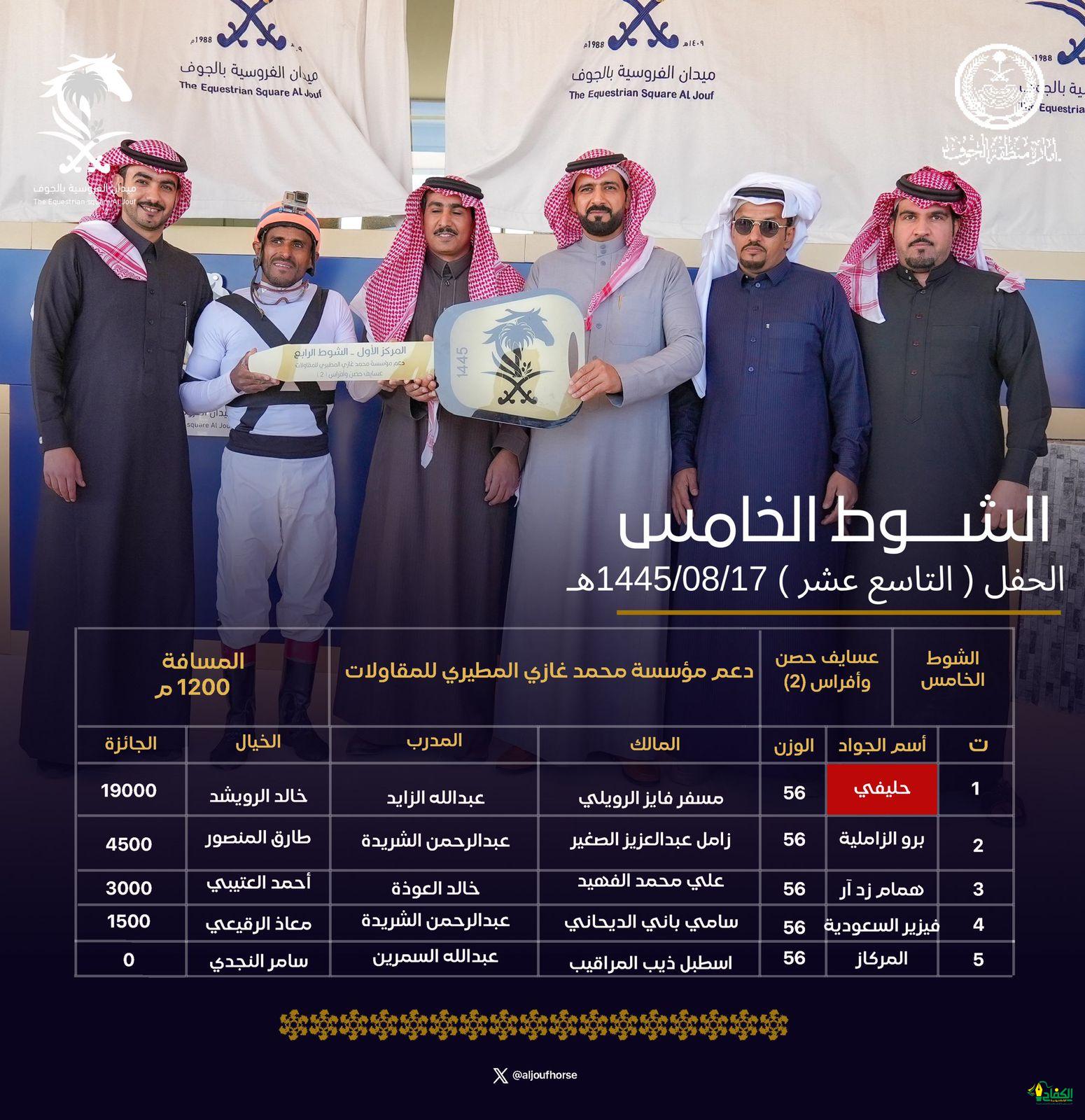 وفاز بالشوط الرابع الجواد “نامل” والمالك والمدرب سعد الرويلي والخيال سامر النجدي، وفاز بالشوط الخامس الجواد “حليفي” والمالك مسفر الرويلي والمدرب عبدالله الزايد والخيال خالد الرويشد.