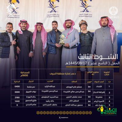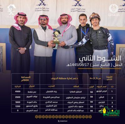 والمالك عبدالعزيز العبدلي والمدرب خالد رشيد والخيال عبدالله المساعد، وفاز بالشوط الثاني الجواد “الركن الوثيق” والمالك إسطبل الطنايا والمدرب زياد الشايش والخيال نمر مقنط، وفاز بالشوط الثالث الجواد “اشتداد” والمالك مسفر الرويلي والمدرب عبدالله الزايد والخيال نمر مقنط.