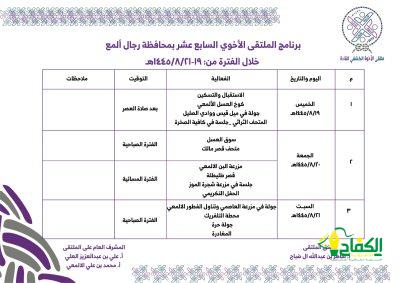 تستضيف محافظة رجال المع الملتقى الكشفي الأخوي السابع عشر للقادة الكشفيين اليوم الخميس ١٩ شعبان ويستمر حتى ٢١ من الشهر بدعوة كريمة من مكتب رواد كشافة محافظة رجال المع ويشارك في الملتقى مجموعة من الرواد والقادة الكشفيين من مختلف مناطق ومحافظات المملكة العربية السعودية ويتضمن برنامج الملتقى مجموعة من الزيارات واللقاءات وزيارة أبرز المعالم الاثرية والتاريخية ، والتراثية يأتي أبرزها مساء اليوم الخميس زيارة المتحف التراثي وكوخ العسل الالمعي وجولة في ميل قيس ووادي الصليل ويوم الجمعة زيارة سوق العسل ومتحف قصر مالك وزيارة قصر طليطلة وجلسة في مزرعة شجرة الموز ويختتم الملتقى يوم السبت بزيارة مزرعة العاصمي وتناول الفطور الالمعي ومن ثم حفل التكريم وجولة حرة والختام.