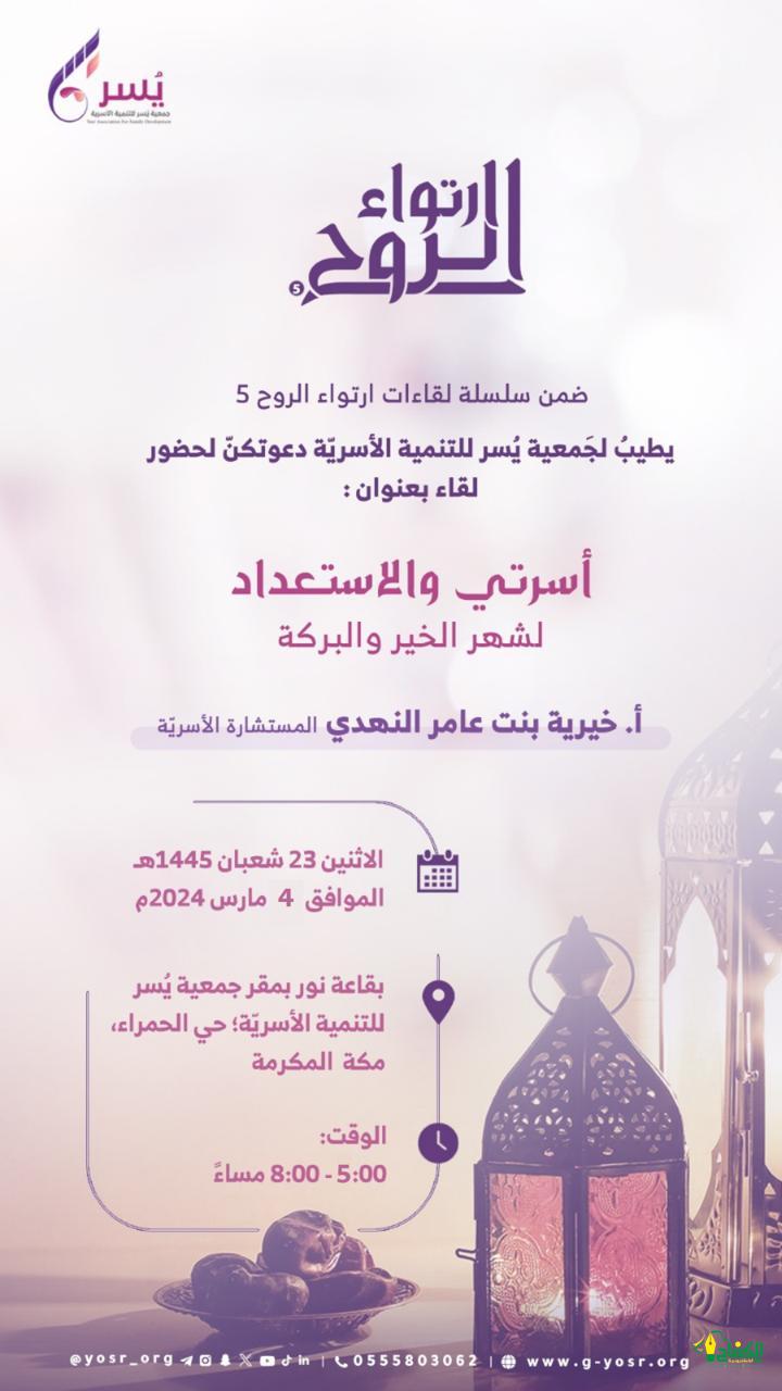 واشارت الدكتورة هيفاء فدا : وضمن مبادرات الجمعية والأنشطة والفعاليات والملتقيات والبرامج التي تنظمها تنظم الجَمعية لقاء بعنوان : ( أسرتي والاستعداد لشهر الخير والبركة) وذلك ضمن سلسلة لقاءات (ارتواء الروح ).