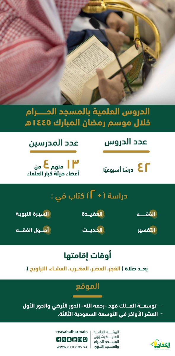 أصدرت الهيئة العامة للعناية بشؤون الحرمين: مواعيد الدروس العلمية خلال شهر رمضان المبارك في المسجد الحرام للعام الحالي 1445 هجرية حيث بلغت عدد الدروس (42) درسا أسبوعيا وعدد المدرسين( 13) مدرس، منهم (4) من أعضاء هيئة كبار العلماء دراسة ( 20) كتاب في:- الفقه – التفسير – العقيدة – الحديث – السيرة النبوية – أصول الفقه أوقات إقامتها :- بعد صلاة الفجر – العصر – المغرب – العشاء والتراويح الموقع :- توسعة الملك فهد – رحمه الله – الدور الأرضي والدور الأول وفي العشر الأواخر من شهر رمضان المبارك في التوسعة السعودية الثالثة.