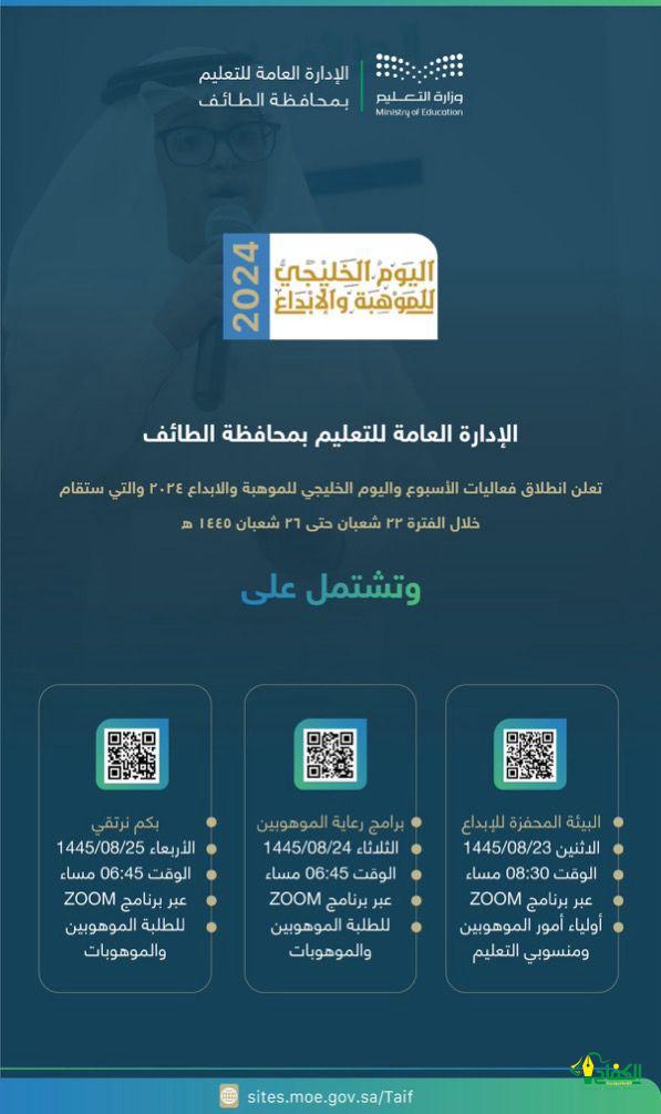 نفذت الادارة العامة للتعليم بمحافظة الطائف ممثلة في إدارة تنمية القدرات قسم الموهوبين، الأسبوع الوطني واليوم الخليجي للموهبة والإبداع 1445هـ وذلك في جميع المدارس ، خلال الفترة من 22 – 26 / 8 / 1445هـ . وتضمنت خطة الفعاليات المقترحة للمدارس في هذه المناسبة حيث كانت بدايتها من خلال الافتتاح في طابور الصباح والإذاعة المدرسية لإبراز هذه دور الموهبة في المجتمع ، وخلال الخمس دقائق الأولى من الحصة يتم استعراض تجارب المبدعين.