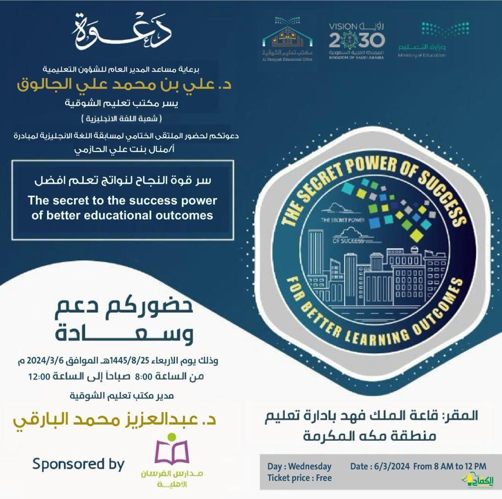 نظمت الإدارة العامة للتعليم بمكة المكرمة ممثلة بمكتب تعليم الشوقية برنامج ختام مسابقة اللغة الإنجليزية بعنوان “سر قوة النجاح لنواتج تعلم أفضل” The Secret Power of Success for Better Learning Outcomes” التي نفذتها مشرفة اللغة الإنجليزية منال علي الحازمي ومعلمات اللغة الانجليزية بمكتب تعليم الشوقية، وذلك بحضور المساعد للشؤون التعليمية د. علي الجالوق ومدير إدارة الأداء التعليمي د. مجدي بابطين ومدير مكتب الشوقية د. عبدالعزيز البارقي.