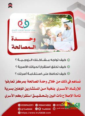 أطلق مركز تعارفوا للإرشاد الأسري ممثلا في وحدة المصالحة باقة جديدة ضمن خدماته المتنوعة وهي باقة الإصلاح الزواجي والاسري وذلك بعد أن شهد المركز إقبالا من الأزواج للحصول على الاستشارة المناسبة للوصول لحلول للمشاكل الزوجية.