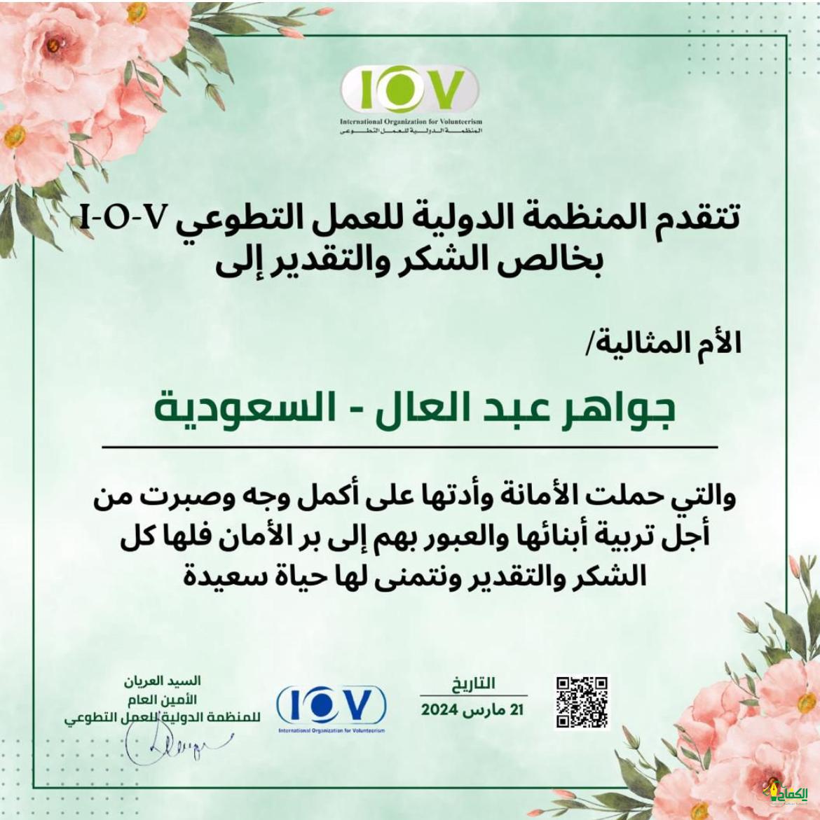 قدمت المنظمة الدولية للعمل التطوعي I-O-V بخالص الشكر والقدير إلى الأم المثالية / جواهر عبدالعال – السعودية والتي حملت الأمانة وأدتها على أكمل وجه وصبرت من أجل تربية أبنائها والعبور بهم إلى بر الأمان فلها كل الشكر والتقدير ونمتنى لها حياة سعيدة.