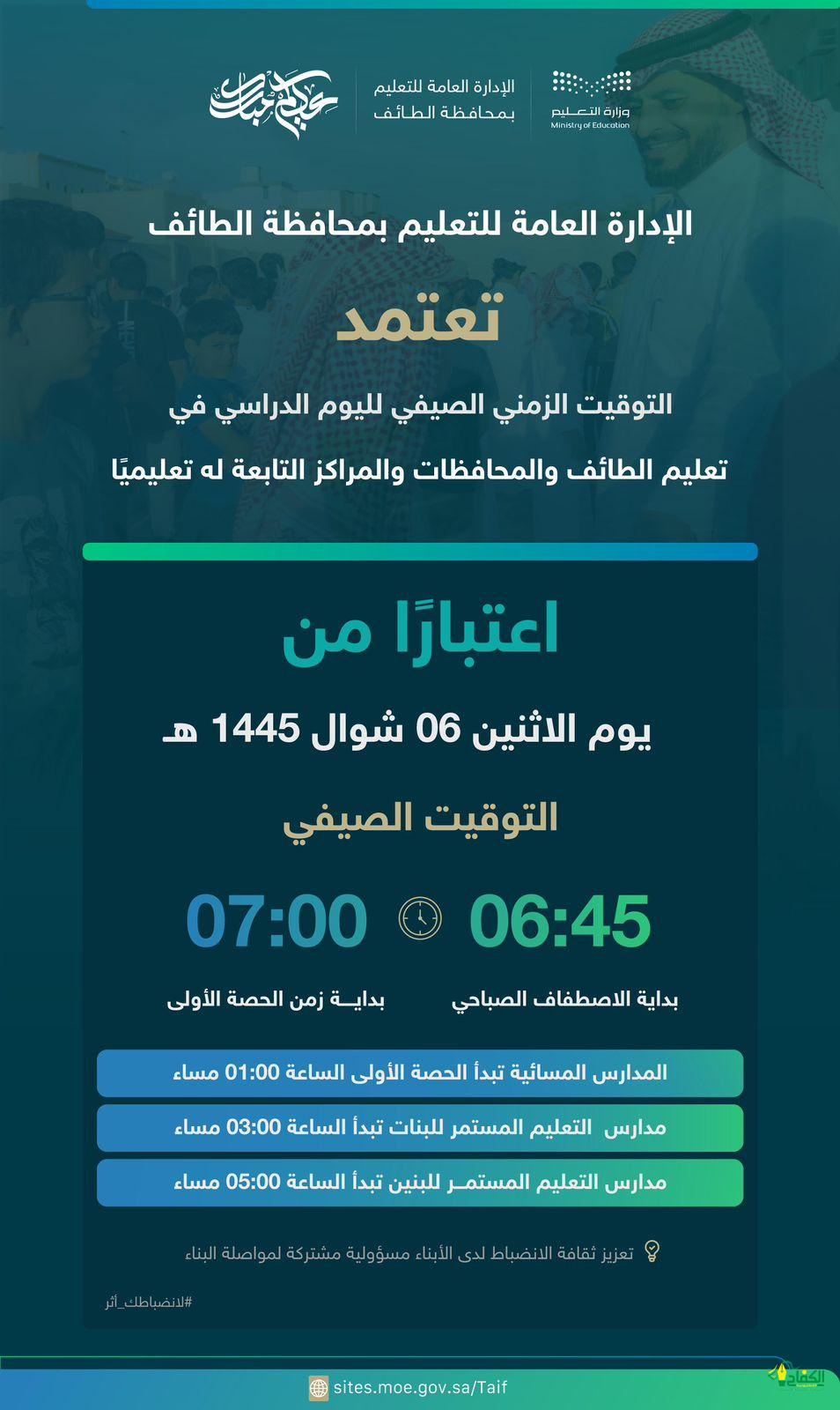 أقرت الإدارة العامة للتعليم بالطائف بدء تطبيق الدوام الصيفي يوم الاثنين 6 شوال 1445هـ وأوضح المدير العام للتعليم بالطائف الدكتور سعيد بن عبدالله الغامدي أن موعد تطبيق الدوام الصيفي للمدارس بالطائف والمحافظات والمراكز التابعة لها تعليمياً بكافة المراحل للبنين والبنات سيكون اعتباراً من يوم الاثنين 06 شوال 1445هـ وسيكون الاصطفاف الصباحي الساعة (6:45) صباحاً وبداية الحصة الأولى الساعة (7:00) صباحاً , والمدارس المسائية تبدأ الحصة الأولى الساعة 01:00مساءً ، وفي مدارس التعليم المستمر للبنات الساعة 03:00 مساءً ، ومدارس التعليم المستمر للبنين الساعة 05:00مساءً.