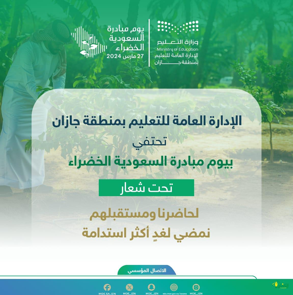 شاركت الإدارة العامة للتعليم بمنطقة جازان في الاحتفاء بيوم مبادرة السعودية الخضراء تحت عنوان “لحاضرنا ومستقبلهم نمضي لغدٍ أكثر استدامة ” والتي تهدف لتعزيز جهود حماية البيئة وتسريع رحلة انتقال الطاقة وبرامج الاستدامة وتقلل الانبعاثات الكربونية وتزيد من أعمال التشجير واستصلاح الأراضي وتحمي المناطق البرية والبحرية في المملكة وتعالج تحديات تغيرات المناخ.