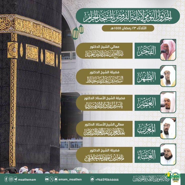 أعلنت رئاسة الشؤون الدينية بالمسجد الحرام والمسجد النبوي ممثلة في وكالة شؤون الائمة والمؤذنين بالمسجد الحرام جدول يوم الثلاثاء ٢٣ /٩/ ١٤٤٥هـ لأئمة المسجد الحرام وبحسب الجدول حيث يؤم المصلين في صلاة الفجر معالي الشيخ الدكتور صالح بن حميد وصلاة الظهر فضيلة الشيخ الدكتور أسامة خياط وصلاة العصر فضيلة الشيخ الاستاذ الدكتور ياسر الدوسري وصلاة المغرب معالي الشيخ الاستاذ الدكتور عبدالرحمن السديس وصلاة العشاء فضيلة الشيخ الدكتور ماهر المعيقلي.