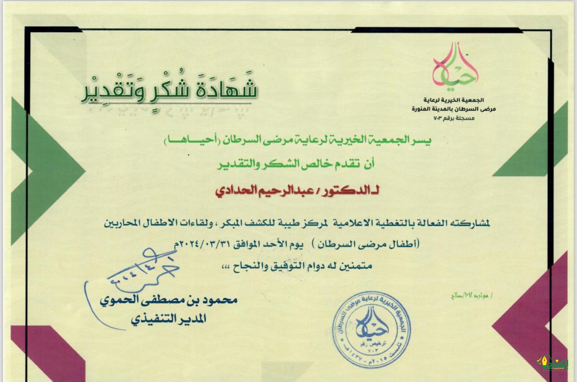 كرمت – الجمعية الخيرية لرعاية مرضى السرطان ( أحياها ) بالمدينة المنورة رئيس تحرير صحيفة الكفاح نيوز – الدكتور- عبدالرحيم الحدادي بمناسبة المشاركة الفعالة بالتغطية الإعلامية لمركز طيبة للكشف المبكر ولقاءات المحاربين ( أطفال مرضى السرطان ) يوم الأحد 31- 3- 2024