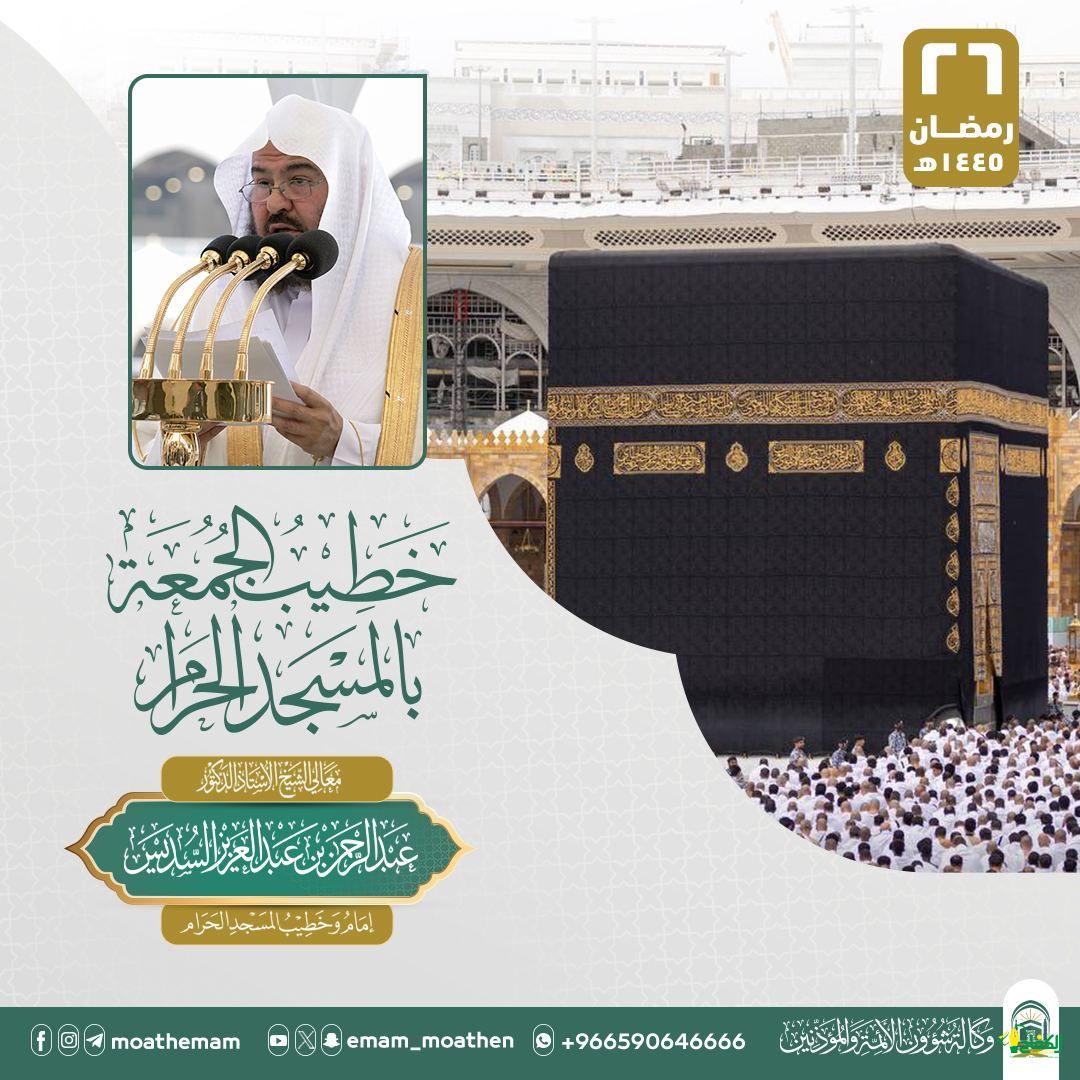 حددت وكالة شؤون الأئمة والمؤذنين بالهيئة العامة لشؤون المسجد الحرام والمسجد النبوي الشريف خطيب يوم بعد غد الجمعة 26 رمضان 1445هـ بالمسجد الحرام معالي الشيخ الأستاذ الدكتور عبدالرحمن بن عبدالعزيز السديس الجدير بالذكر أن هذه آخر جمعة خلال شهر رمضان المبارك الحالي.