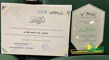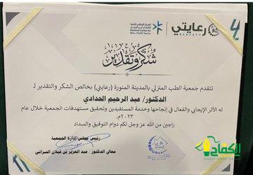 وتسلم التكريم رئيس التحرير الدكتور – عبدالرحيم الحدادي من يد نائب رئيس مجلس إدارة جمعية الطب المنزلي الأستاذ – أشرف مددين بحضور المدير التنفيذي للجمعية الأستاذ – باسم الجهني في الملتقى الذي عقد مساء أمس في مقر الجمعية بمركز مكافحة السرطان ( أحياها)