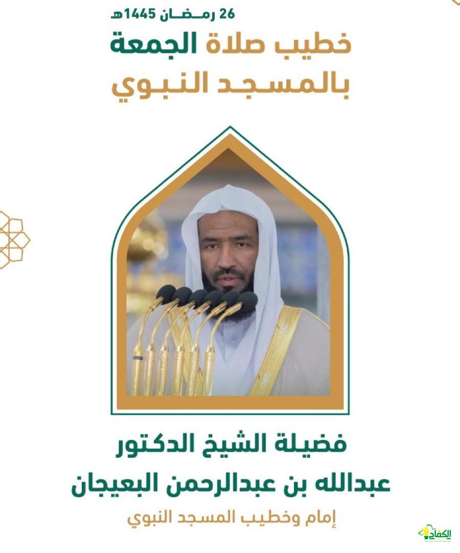 حددت وكالة شؤون الأئمة والمؤذنين بالهيئة العامة لشؤون المسجد الحرام والمسجد النبوي الشريف خطيب يوم غد الجمعة 26 رمضان 1445هـ بالمسجد النبوي الشريف فضيلة الشيخ الدكتور عبدالله بن عبدالرحمن البعيجان.