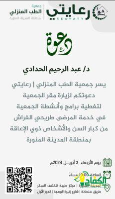 قال الأستاذ – أشرف مددين نائب رئيس مجلس إدارة جمعية الطب المنزلي بالمدينة المنورة ( رعايتي ) نشكر جميع الزملاء الإعلاميين لدعمهم للجمعية إعلاميا للمستفيدين من الجمعية من المرضى كبار السن وهذه الجمعية أسست لخدمة الجميع كما أشكر رجال الأعمال وأهل الخير ممن يقدمون المساعدات والدعم للجمعية ،مشيرا مددين أنهم وصلوا حتى هذا اليوم 24 رمضان 1445 إلى أكثر من 15 ألف مستفيد والعمل في الجمعية مستمر إلى مالا نهاية.