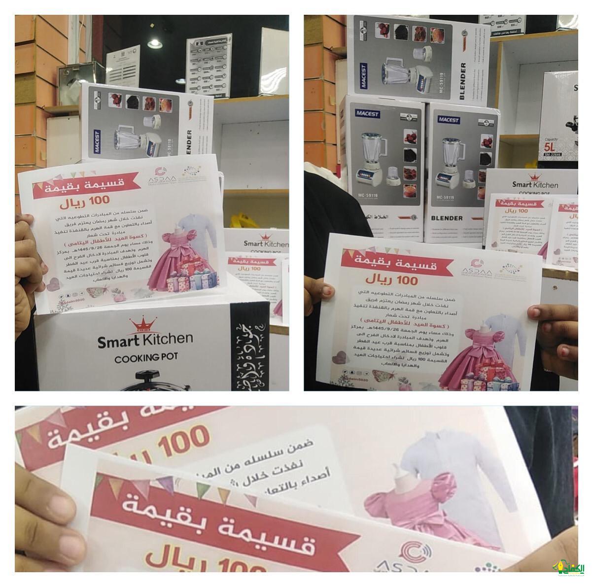 في إطار تفعيل المبادرات الإنسانيّة والاجتماعيّة والبرامج الهادفة التي تجسد روح التعاون والأخوة والحرص على تعزيز التكافل الاجتماعي أقام فريق أصداء الإعلامي التطوعي بجمعيّة بصمّة شباب التطوعيّة بالقنفذة بقيادة الأستاذة ليلى الشيخي وذلك بالتعاون والمشاركة مع قمّة الهرم بالقنفذة مساء أمس الجمعيّة مبادرة “كسوة العيد للأطفال الأيتام ” بحضور قائدة فريق أصداء ومشاركة العضوات في عمليّة توزيع القسائم الشرائية على الفئات المستهدفة لا كثر من ٥٠ طفل وطفله من فئة الأيتام بمناسبة قرب عيد الفطر المبارك لشراء الملابس واحتياجات العيد و تخلل المبادرة توزيع الهدايا والالعاب وأكّدَت ليلى الشيخي أن تنفّيذَ المبادرة ضمّن جهود الفريق وأعماله الاجتماعيّّة لصناعة الأثر المجتمعي وتستهدّفَ توزيع الكسوة على مستفيديّها لمجموعة من الأطفال لإسعادهم وإدخال البهجة والسرور إلى قلوبهم ومشاركتهم فرحتهم.