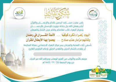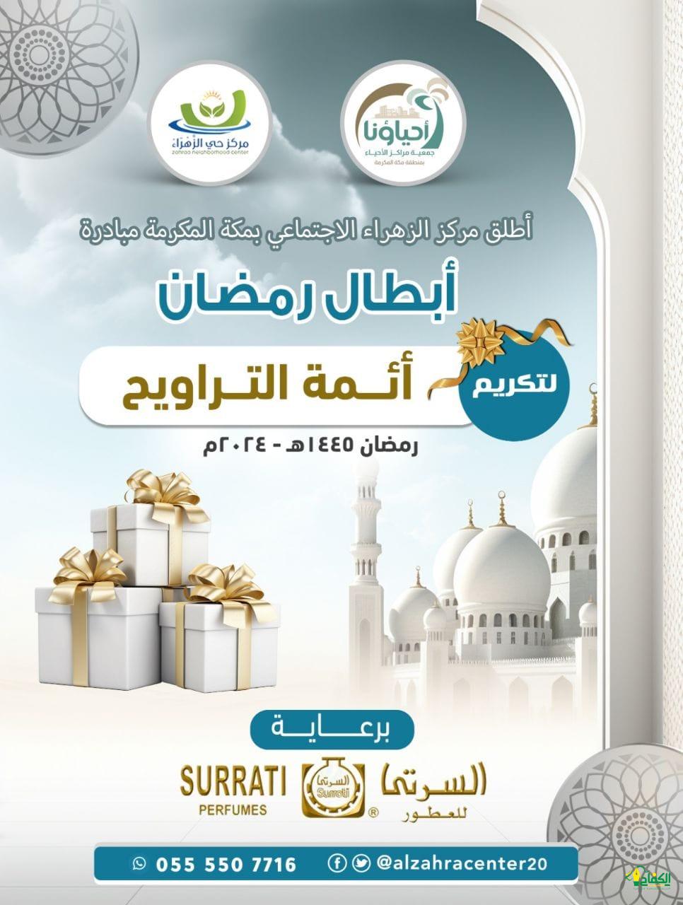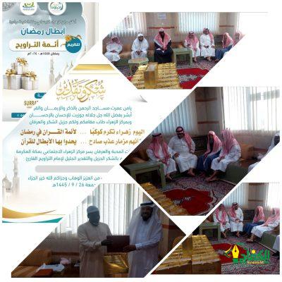 كرم مركز الزهراء الاجتماعي بمكة المكرمة أشراف جمعية مراكز الأحياء في بادرة سنوية تكريم أئمة التراويح بمنطقة الزهراء بمكة المكرمة يفوق عددهم اكثر من مائة إمام نظير جهودهم طوال شهر رمضان المبارك يتلون أيات الله بصوت ندي ،وشارك في التكريم