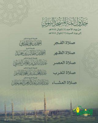 اعتمدت ‘رئاسة الشؤون الدينية بالمسجد الحرام والمسجد النبوي ‘ الجدول الأسبوعي لأئمة المسجد الحرام والمسجد النبوي اعتبارًا من يوم الاحد الموافق ١٤٤٥/١٠/٥ حتي يوم السبت ١٤٤٥/١٠/١١