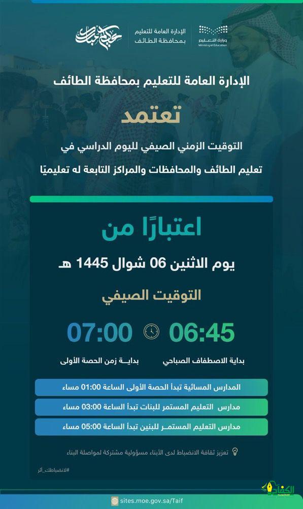 فيما أوضحت الإدارة العامة للتعليم بالطائف عن بدء تطبيق الدوام الصيفي غدًا الاثنين في كافة المراحل الدراسية للبنين والبنات للعام الحالي 1445هـ.