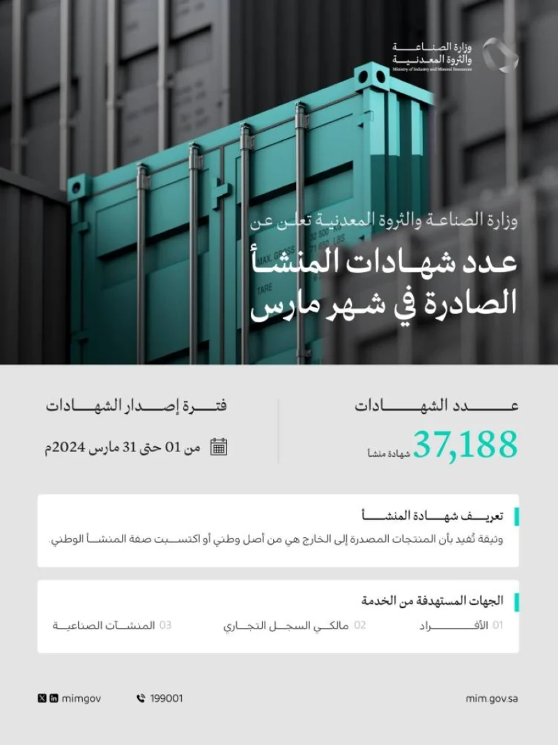 وأوضحت الوزارة أنه يمكن التقديم للحصول على شهادة المنشأ من الموقع الإلكتروني للوزارة من خلال الرابط: https://coo.mim.gov.sa/