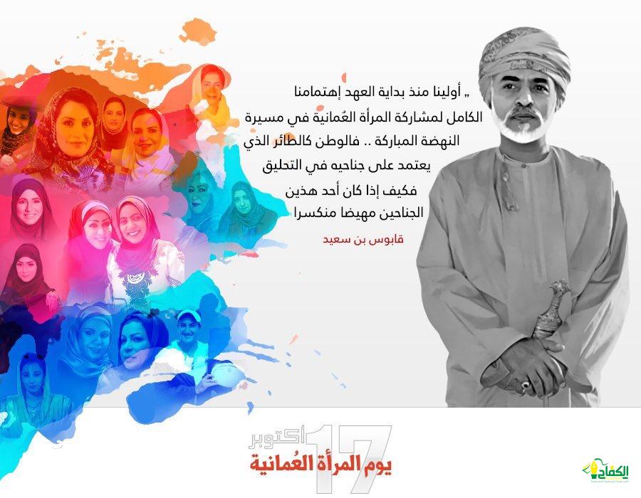 وإيمانًا بدور المرأة العُمانية فقد خُصّص يوم للاحتفاء بها في سلطنة عُمان في يوم الـ 17 من أكتوبر من كل عام ليكون يومًا للمرأة العُمانية تتويجًا لمساهماتها ودورها الريادي في دفع عجلة التقدم بمختلف المجالات الاجتماعية والاقتصادية والثقافية والعلمية والسياسية، بناءً على التوجيهات السامية للسلطان الراحل قابوس بن سعيد.